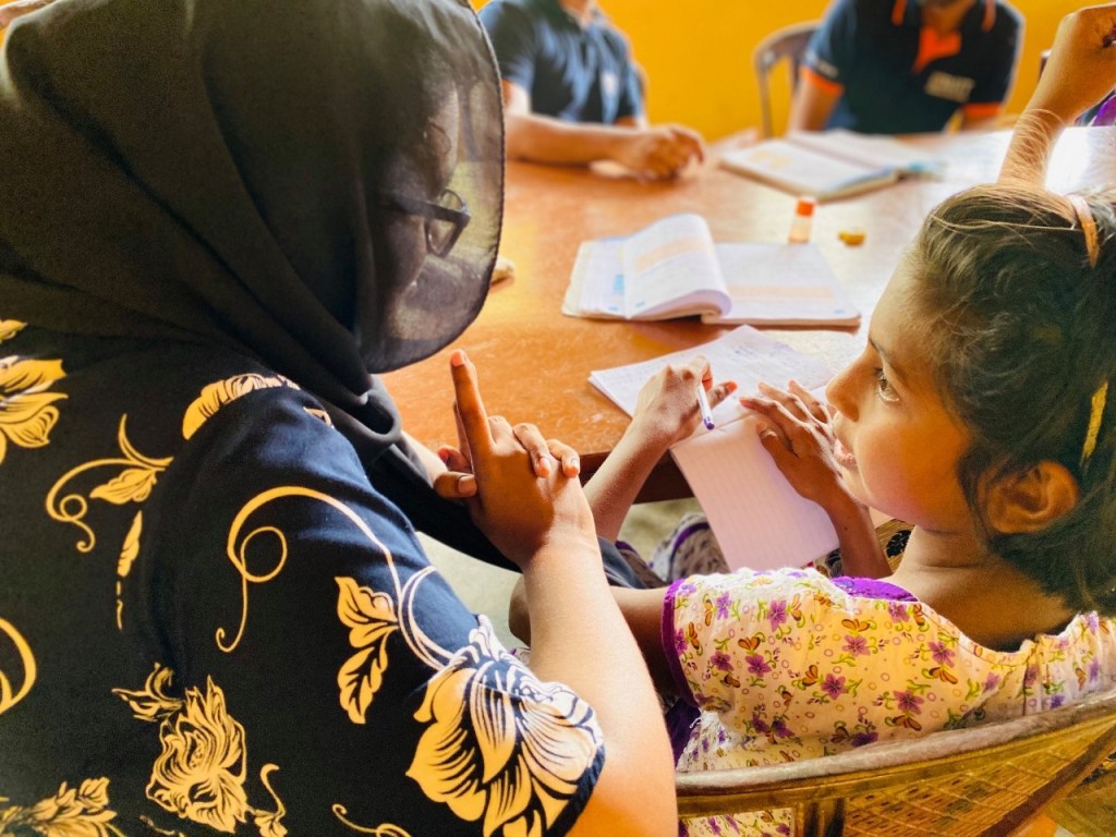 Soon as we enter, the kids flock around, curious on what is going to be taught. As there are kids from different grades, they are separated, with the little ones in one section and the bigger ones in another. According to their grades, the kids get different activities for the day. If the session is allocated to teach Mathematics, the small kids get printed exercises to complete. We always see a small competition here, where everyone tries to be the first to finish all their sums correctly and receive praise from us 🙂 Since these beautiful flower buds lack the caring and praise of a mother, so they expect it from us who have become their new family. The volunteers sit around the table, guiding the little kids step by step, when necessary. The girls from grade 5 and above are also being guided similarly. They are being taught the lessons in the government issued textbooks, in an interesting way and the girls clear their doubts they had through the week. We try to clear out all their problems and also teach them easier ways and short cuts to solve Mathematics sums.