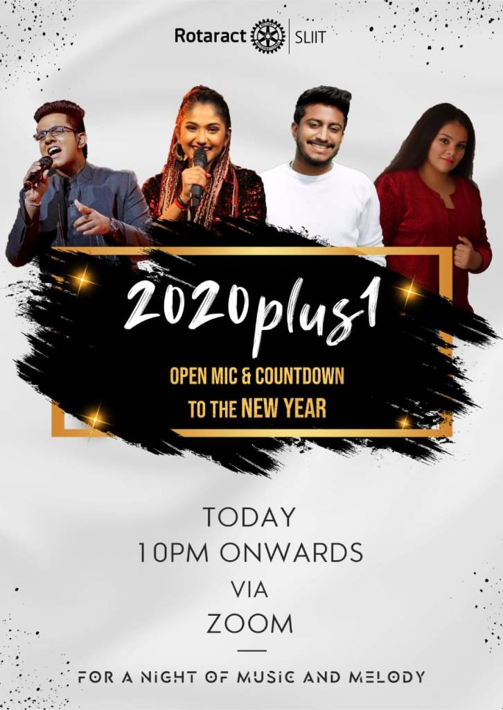 2020 plus 1 යනු සමාජ සේවා අංශය යටතේ SLIIT රොටරැක්ට් සමාජය විසින් 2020 වර්ෂය සඳහා කරන ලද අවසාන ව්යාපෘතියයි. මෙය අළුත් අවුරුදු උදාව වෙනුවෙන් සැකසුනු, ” විවෘත මයික් රාත්රියක්” විය. එය අමතක නොවන දිනයක් මෙන්ම සහභාගී වූ සියලු දෙනාටම සංගීතය සහ ආකර්ෂණීය ක්රීඩා සහිත විය. මෙම කැපී පෙනෙන සමාජ සේවා වැඩසටහන 2020 දෙසැම්බර් 31 වන දින රාත්රී 10 සිට Zoom හරහා සිදු විය.රාත්රී 10 ට අපේම දිස්ත්රික් රොටරැක්ට් නියෝජිත Rtr. කසුන් සිගේරා විසින් ගායනා කරන ලද සුන්දර ගීතයක් සමඟ ප්රසංගය ආරම්භ විය. අපේ ආදරණීය වැඩසටහන් මෙහෙයවන්නන් දෙදෙනා නොවන්නට රාත්රිය ආකර්ශණීය නොවන්නට ඉඩ තිබුනි . මෙම සුන්දර රාත්රිය විහිළු සහ සිනහවෙන් පිරී තිබුණි.